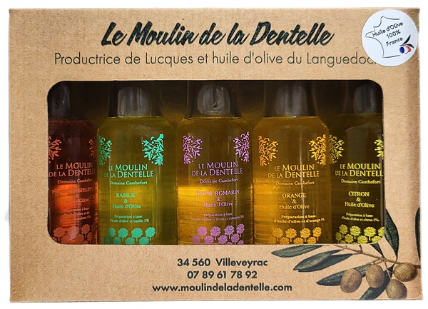 Coffret découverte composé de 5 bouteilles de 10cl : huiles aromatisées basilic, citron, orange, piment d'espelette, gingembre