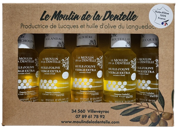 Coffret découverte composé de 5 bouteilles de 10cl de différentes monovariétés du Moulin.