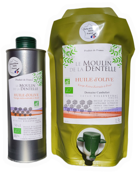 Huile d’olive extra vierge issue d'un assemblage AOP (Olivière et Picholine) en agriculture biologique.