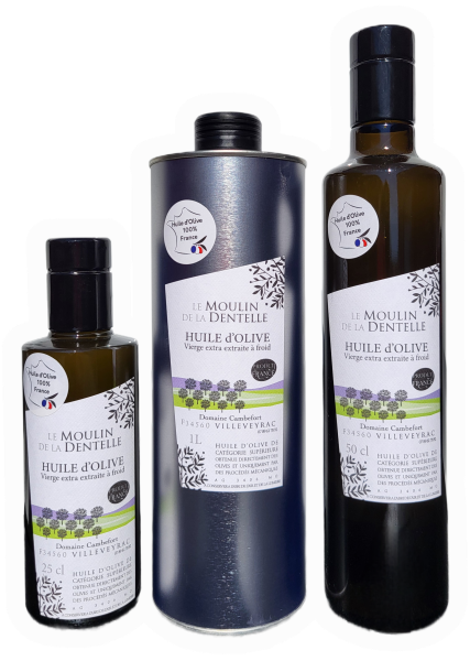 Huile d'olive pressée de plusieurs variétés du domaine qui donne une huile d'un parfait équilibre au fruité intense avec une légère amertume.