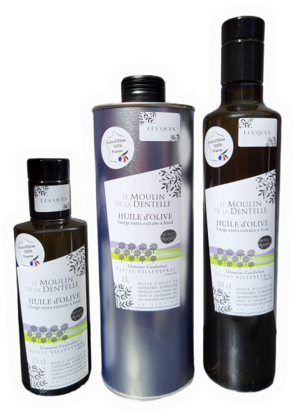 Huile d'olive pressée de plusieurs variétés du domaine qui donne une huile d'un parfait équilibre au fruité intense avec une légère amertume.
