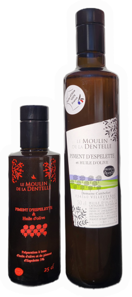 L'huile d'olive au Piment d'Espelette est un mélange de plusieurs variétés d’olives et de Piment d'Espelette broyés ensemble.