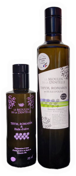 Huile d'olive au thym et romarin issue de plusieurs variétés d'olive broyées directement avec du thym et du romarin